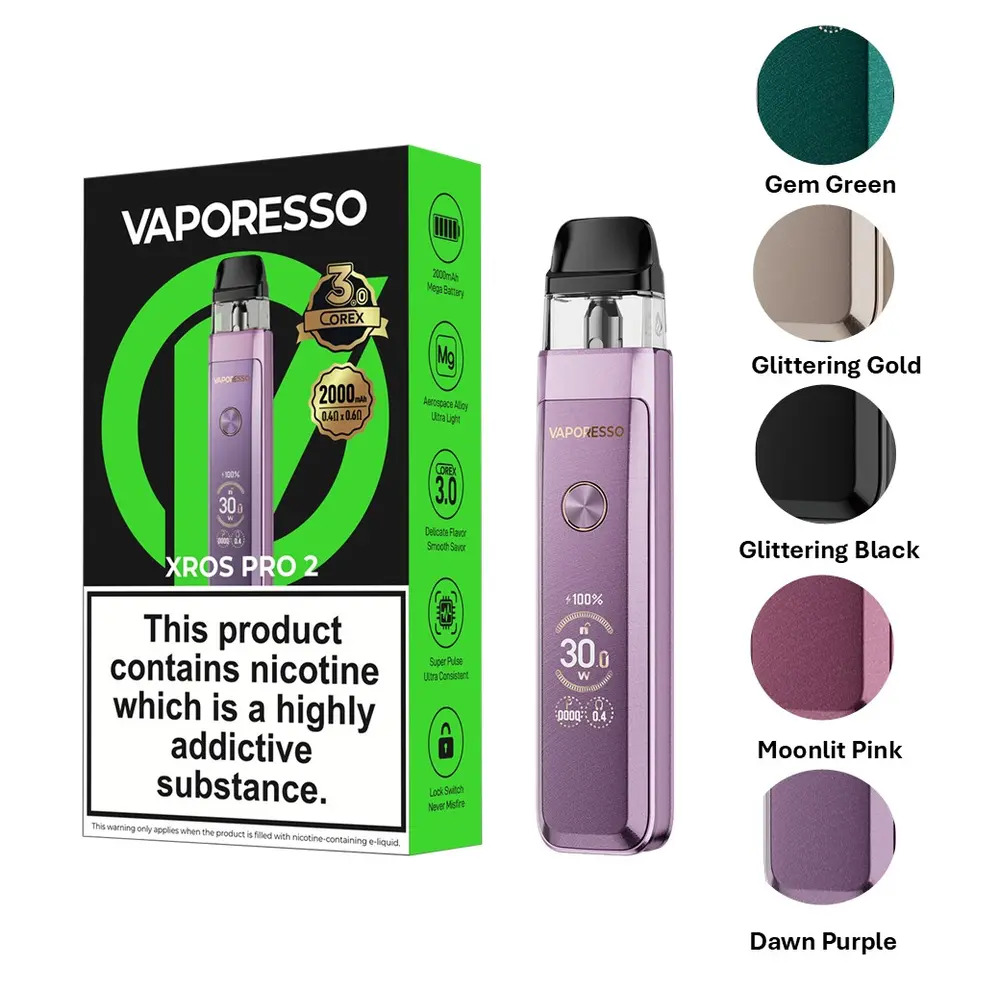 The Vaporesso XROS Pro 2 Pod Vape Kit is a sleek, premium pod system designed for exceptional flavour, reliability, and performance. Built with Vaporesso’s advanced mesh coil technology and adjustable airflow, the XROS Pro 2 delivers smooth, satisfying vapour with rich taste in every draw. Its ergonomic, durable design fits comfortably in your hand or pocket, while the easy top-fill pods and USB-C fast charging make refills and recharges effortless. Whether you’re new to vaping or upgrading your device, the XROS Pro 2 offers a perfect blend of convenience and power, ideal for mouth-to-lung (MTL) vaping and flavour enthusiasts alike.