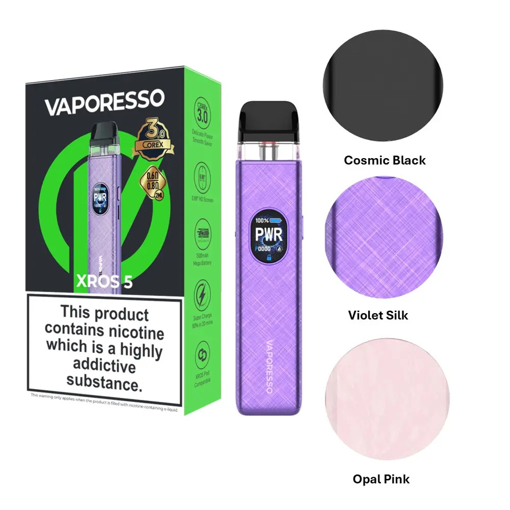 The XROS5 is a premium MTL/RDL pod kit featuring a 1500mAh battery with fast 3A USBC charging, an 0.88" colour HD screen with theme options, adjustable airflow, and dual firing modes (draw and button activation). Powered by COREX3.0 mesh pod technology, it delivers consistent flavour across various resistance pods.